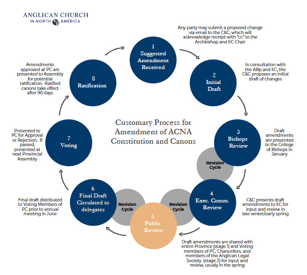 Before any proposal to amend the canons or constitution can even be considered, under current practice it goes through a chain of internal reviews by the College of Bishops, the Executive Committee, and the Governance Task Force (now called the “Provincial Constitution and Canons Committee”). You can see this clearly in the official flowchart of the amendment process below.